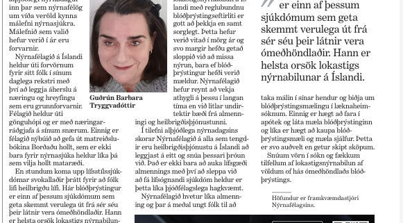 Sú staðreynd að það sé hægt að fækka þeim sem fá lokastigs nýrnabilun á Íslandi með reglubundnu blóðþrýstings eftirliti er gott að vita en samt svo sorglegt. Þetta hefur verið vitað í mörg ár og svo margir hefðu getað sloppið við að missa nýrun , bara ef að tekið hefði verið á þessu.